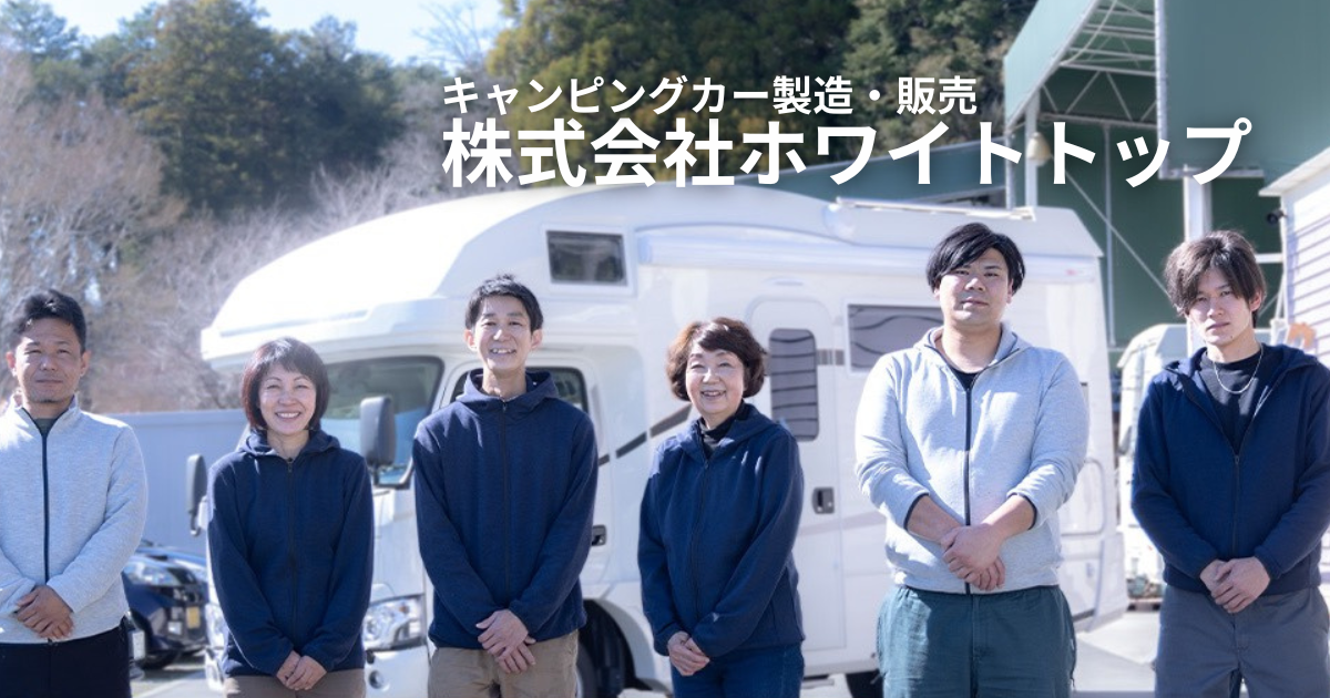 株式会社ホワイトトップは、キャンピングカーの製造、販売をしています。1983年創業、40年以上の歴史の中で次代に合わせて、全国のお客様から依頼があり、ひとりひとりのニーズにお応えするため、さまざまな創意工夫を凝らした車両を提供しています。